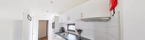 The modern kitchen is fully equipped, including various built-in appliances. From the kitchen, you walk through to the bright living room, which has a pleasant atmosphere thanks to large windows and double French doors.