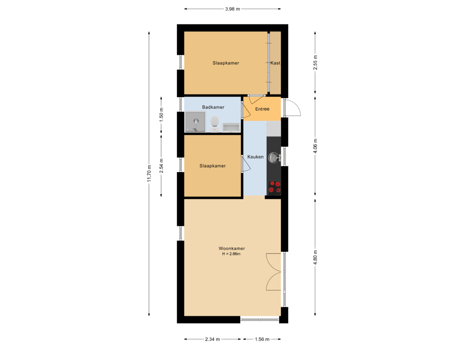 Upon entering, you step into the entrance hall, where the first bedroom is immediately accessible. This room offers space for a double bed and has convenient built-in closet space. The adjacent bathroom is modern and equipped with a shower, toilet, and stylish sink. Next to the bathroom is the second bedroom.