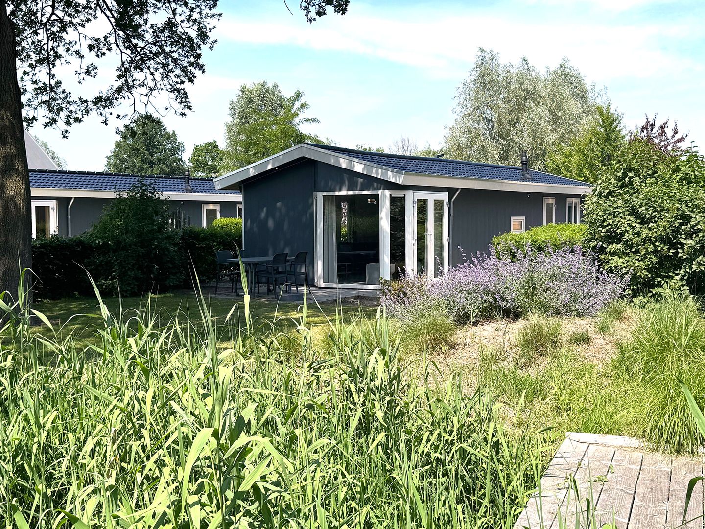 The holiday home features a spacious living room with an open-plan dining and living area. The combination of large windows and a high ceiling creates a feeling of spaciousness and, of course, a beautiful view of the garden and the water feature. French doors open directly from the living room onto your paved terrace, where you can enjoy the spacious garden and your own private spot in the sun.