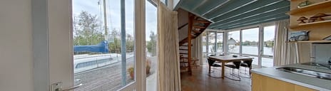 In de woonkamer heeft u aan de oost-, zuid- en westzijde een prachtig uitzicht over het water en de legakkers. In de woonkamer bevindt zich een entresol die het ruimtelijk beeld versterkt en daarnaast veel bergruimte biedt. Kamer en keuken kunnen verwarmd worden met een gezellige houtkachel.
