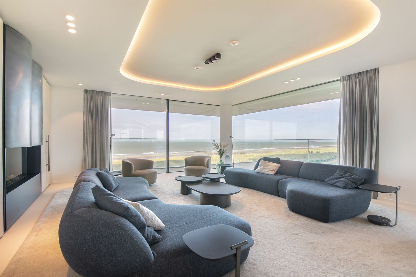 Rechtdoor vind je de deur naar de living. In laatstgenoemde vind je als eerste de luxe Obumex keuken aan je rechterhand, waar je werkelijk van alle gemakken bent voorzien en meer. Hier beschik je over een groot kookeiland met zowel een marmeren aanrecht als houten bar. Verder zit hier nog de wastafel in geïnstalleerd met ertegenover in een grote bijpassende wandkast een tweede marmeren aanrecht met idem achterwand. Hier bevindt zich de inductiekookplaat met erboven in het plafond verzonken het afzuigsysteem. Aan weerszijden beschik je over een tweetal ovens als wel koel/vriescombinaties en uiteraard ontbreekt de vaatwasser niet. Behalve omringd door luxe kook je hier ook nog eens met uitzicht op zee. Ook het riante dakterras dat rondom het appartement loopt is vanuit de keuken te betreden waardoor je net zo makkelijk binnen als buiten tafelt.