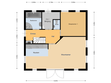 Indeling: hal met vide, toilet, badkamer met ligbad, douchecabine, wastafel met meubel en föhn, bijkeuken/berging met buitendeur, slaapkamer, woonkamer met tuindeuren, elektrische haard en moderne inbouwkeuken (2019, voorzien van afzuigkap, kookplaat, combi-magnetron, koelkast met vriesvak en een vaatwasser). De begane grond is geheel voorzien van plavuizenvloeren.