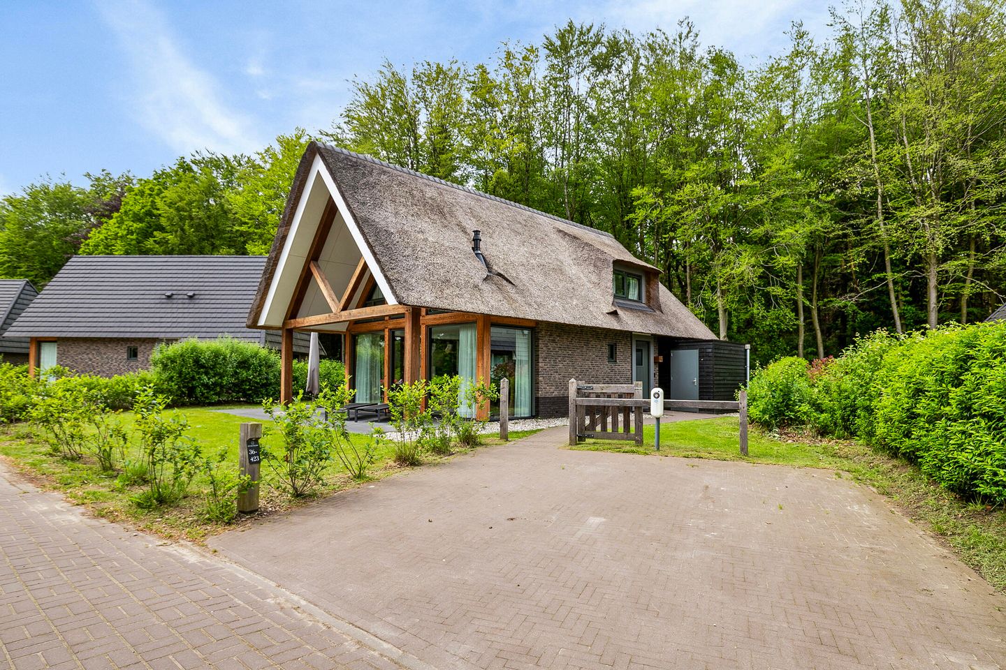 * Hoogwaardige recreatiewoning met rieten kap;