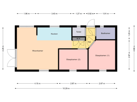 Middels de entree de zuidoostzijde betreedt u het chalet in de hal. De hal biedt toegang tot de badkamer, een separaat toilet en twee 2-persoons slaapkamers. De hal loopt over in de woonkamer met openkeuken.