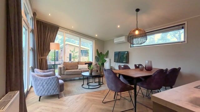 De woonkamer is ruim en sfeervol ingericht, heeft een warme uitstraling en een fraaie visgraat vloer. Via de openslaande deuren heb je direct toegang tot een zonnig terras. Grote raampartijen laten het natuurlijke licht overvloedig binnenstromen, waardoor een fijne, lichte sfeer ontstaat. Voor extra comfort is de woning voorzien van airconditioning. De ouderslaapkamer beschikt over een comfortabel tweepersoonsbed en royale kastruimte met schuifdeuren, terwijl de tweede slaapkamer is ingericht met een stapelbed voor twee personen en een extra los bed met opbergruimte bovenin. Zo biedt de recreatiewoning plaats aan maar liefst vijf personen.