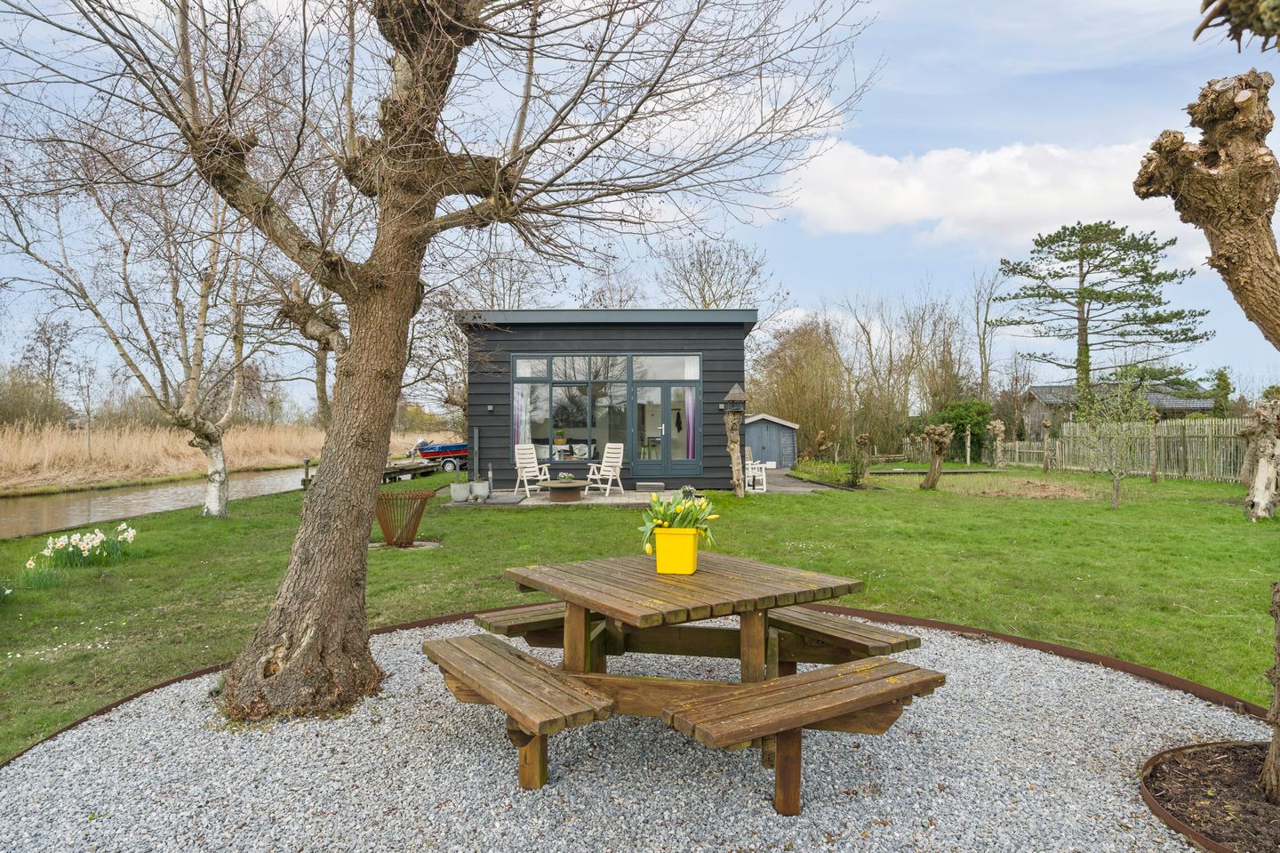 De tuin is fraai aangelegd en bied je diverse plekjes om heerlijk te genieten van de rust, het water en de mooie natuur. Tevens vind je hier nog een houten berging, aanlegplaats voor je boot en een buitenkraan.