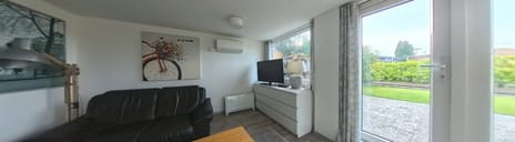 Begane grond: Entree, hal met vaste trap naar de verdieping, garderobe, toegang tot de ruime woon-/eetkamer en een moderne badkamer voorzien van douchcabine, wastafel en zwevend toilet. De woon-/eetkamer beschikt over veel lichtinval door de grote raampartijen, airco, openslaande deuren naar de zonnige tuin en een open keuken voorzien van diverse apparatuur.