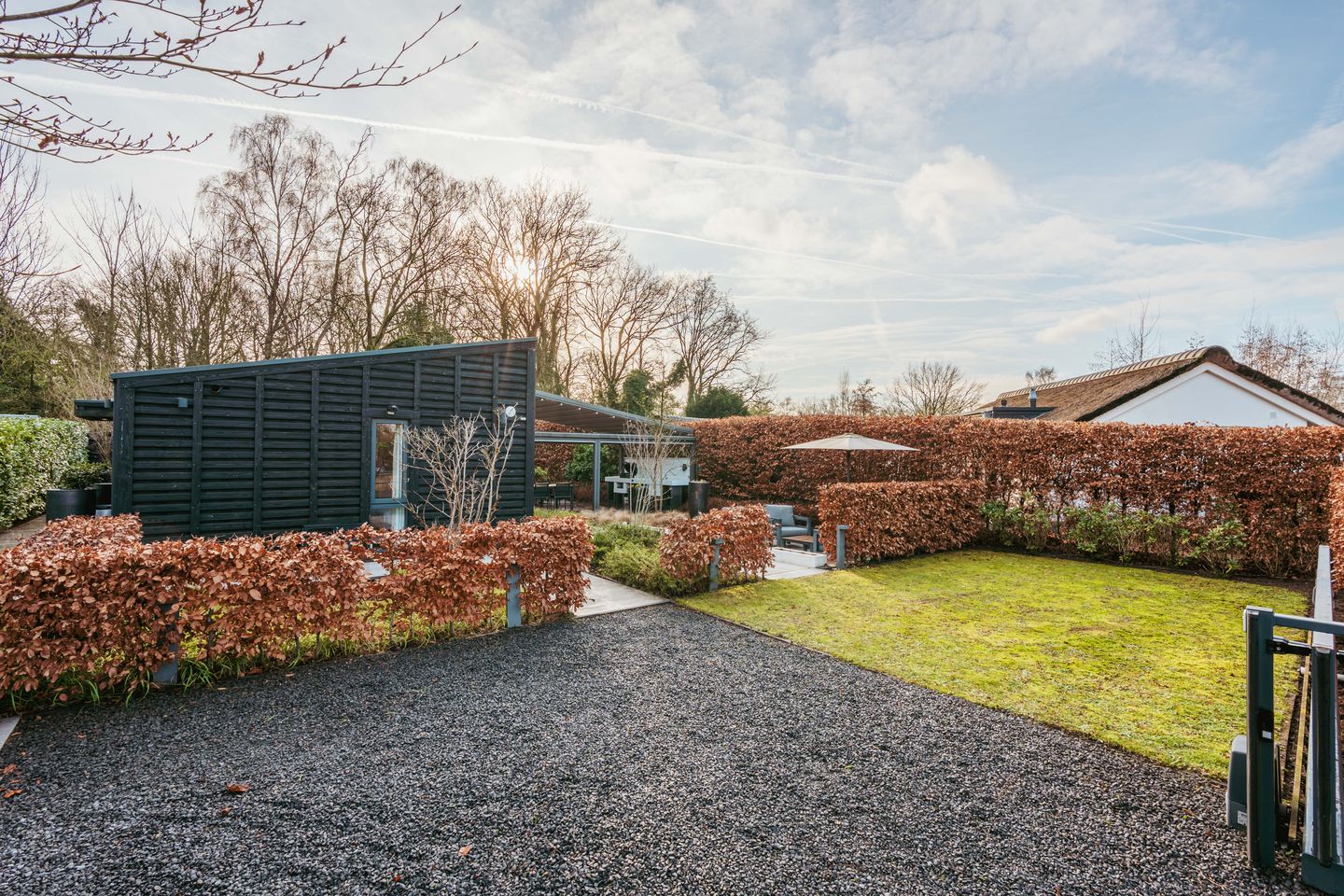 The garden is completely enclosed by a green hedge and offers plenty of privacy. Thanks to its favourable south-west facing position, you can enjoy the sun here until the evening. The front garden has an electric gate and offers space for two parking spaces.