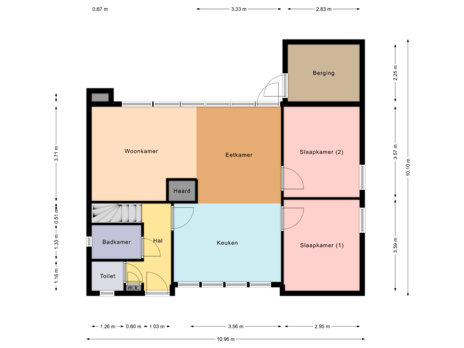 De entree leidt naar de hal, die toegang biedt tot de ruime woon-/eetkamer met open keuken. Vanuit de hal bereikt u tevens de eerste badkamer en een separate toiletruimte. De woonkamer biedt toegang tot twee ruime slaapkamers.