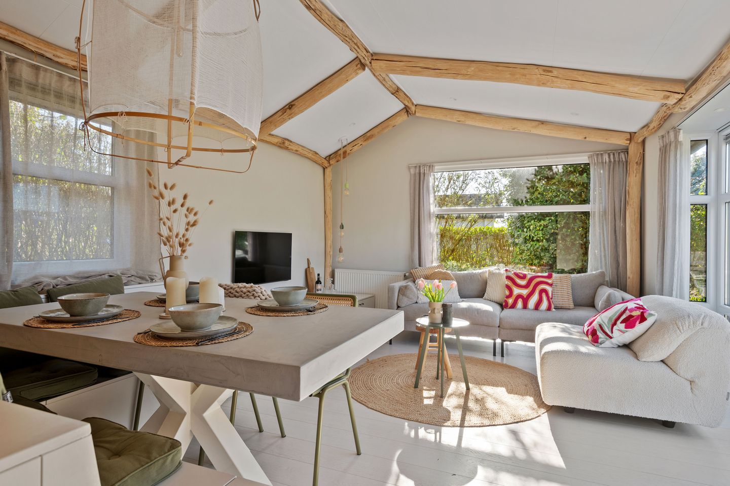 De lichte woonkamer met grote raampartijen en openslaande deuren zorgt voor een directe verbinding met de tuin, waardoor binnen en buiten naadloos in elkaar overlopen. De open keuken is modern uitgevoerd en voorzien van diverse inbouwapparatuur, die in 2021 volledig is vernieuwd, inclusief de spoelbak en kraan. In het eetgedeelte bevindt zich een praktische maatwerkbank met comfortabele zitplaatsen en extra bergruimte. De overige meubelen zijn grotendeels van het merk Zuiver, wat bijdraagt aan de moderne en stijlvolle uitstraling van de woning.