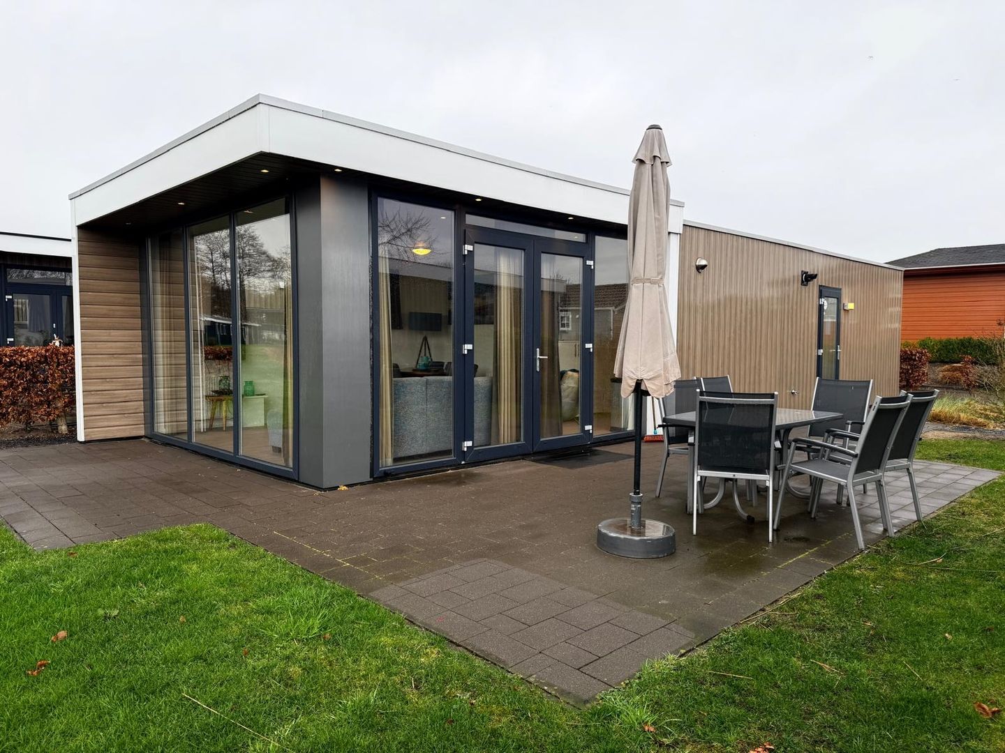 De woonkamer vormt het comfortabele middelpunt van deze 6-persoons recreatiewoning en straalt direct ruimte en rust uit. Dankzij de grote raampartijen wordt de ruimte gevuld met natuurlijk licht en ontstaat er een prettige, open sfeer. Hier komt u samen na een dag aan het water of in de natuur, geniet u van gezellige momenten met familie of vrienden en ervaart u het echte vakantiegevoel. De woonkamer voelt ruim en uitnodigend aan, met voldoende plek voor iedereen om te ontspannen.
