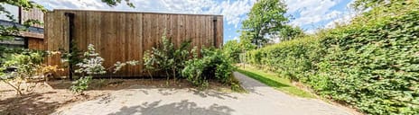 De royale living, met maar liefst twee glazen schuifpuien, zorgt voor een heerlijke lichtinval en een naadloze verbinding met de natuur rondom. Vanuit de woonkamer stap je zo het deels overkapte terras op – een echte eyecatcher die door het speelse ontwerp bijna lijkt te zweven. Dankzij de buitenhaard en het beschutte karakter kun je hier ook op koelere dagen volop genieten van het buitenleven.