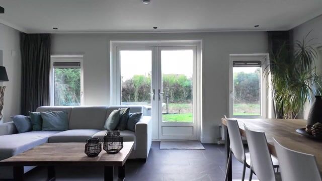 Stap via de zijkant de recreatiewoning binnen. Vanuit de hal heb je toegang tot alle vertrekken. De woonkamer is een fijne lichte ruimte met openslaande deuren waardoor je een fantastisch zicht hebt op de omliggende tuin. Hier creëer je een heerlijke zithoek voor een ontspannen vakantie.