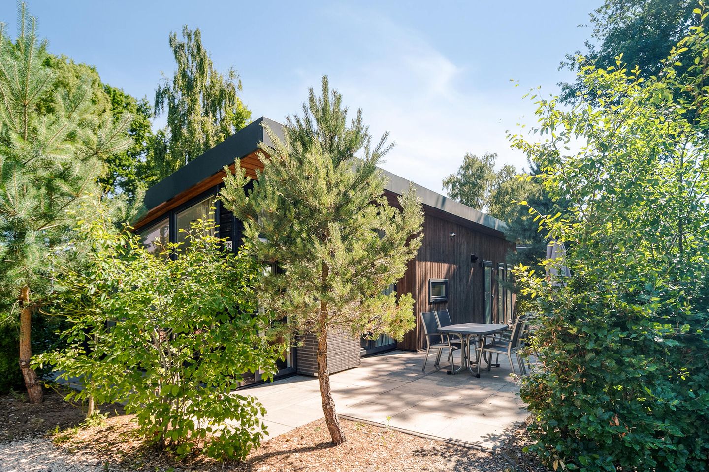 Het in 2022 gebouwde chalet is van alle gemakken voorzien. Dankzij het lessenaarsdak en de vele raampartijen is het binnen heerlijk licht en ruimtelijk. De moderne keuken beschikt over inbouwapparatuur en biedt voldoende werk- en kastruimte voor de hobbykok. De recreatiewoning beschikt over twee comfortabele slaapkamers, waarvan de hoofdslaapkamer is voorzien van een luxe badkamer en suite – een zeldzaam en zeer prettig extraatje.