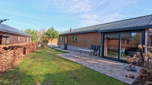 De tuin is netjes onderhouden en biedt voldoende ruimte om buiten te zitten en van de zon te genieten. Op het terras kunt u in alle rust ontspannen terwijl de groene omgeving zorgt voor een prettige, natuurlijke sfeer. De openslaande deuren vormen een mooie overgang van binnen naar buiten, waardoor u op zonnige dagen het buitenleven eenvoudig bij de woning betrekt. Tegelijk zorgen de grote ramen en de openslaande deuren voor een bijzonder prettige en natuurlijke lichtinval in het chalet.