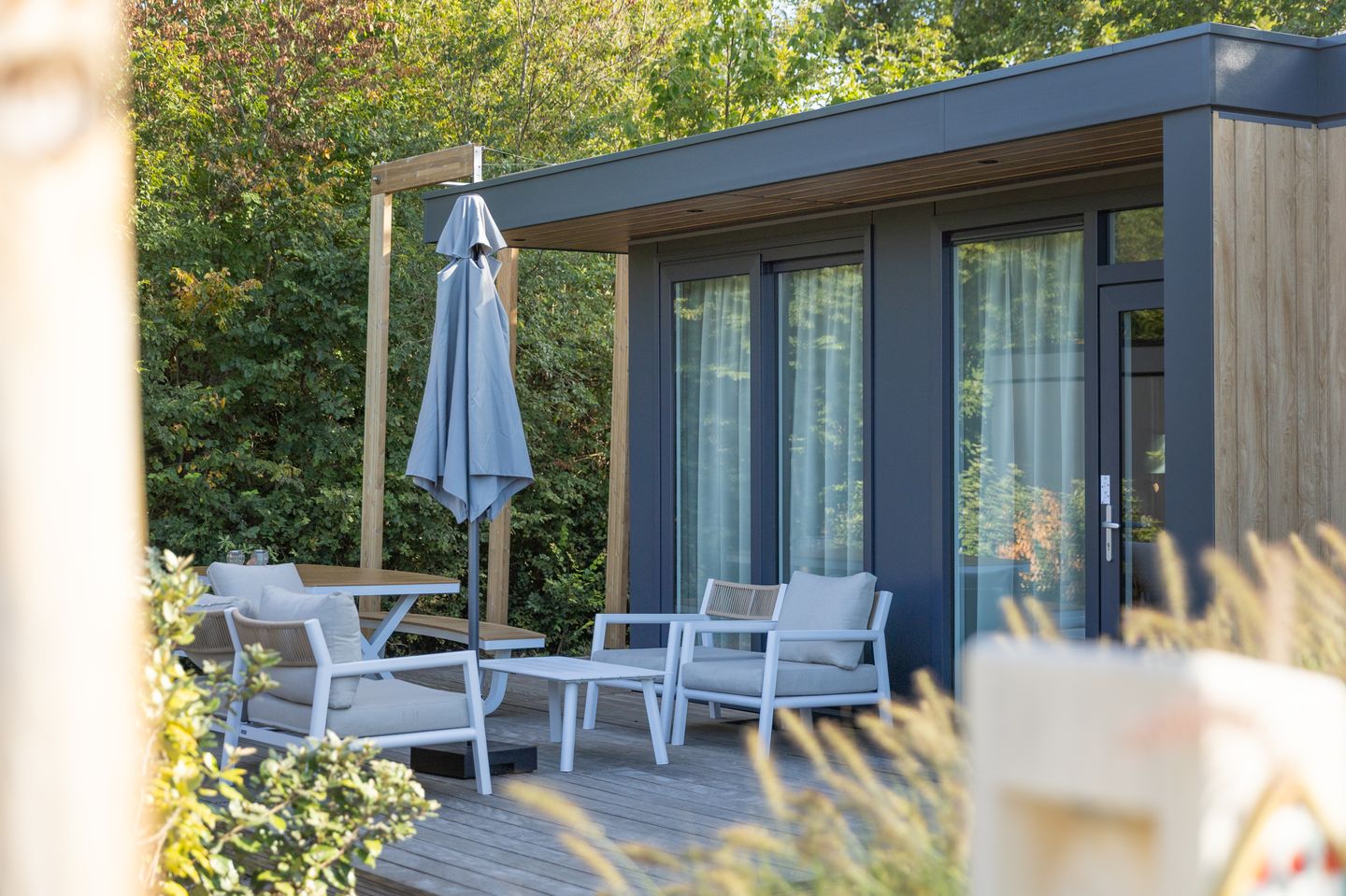 De recreatiewoning beschikt over drie volwaardige slaapkamers, allemaal voorzien van grote raampartijen die uitkijken op de tuin. De master bedroom heeft extra ruimte en comfort. De moderne badkamer is uitgerust met een inloopdouche, wastafelmeubel en designradiator.