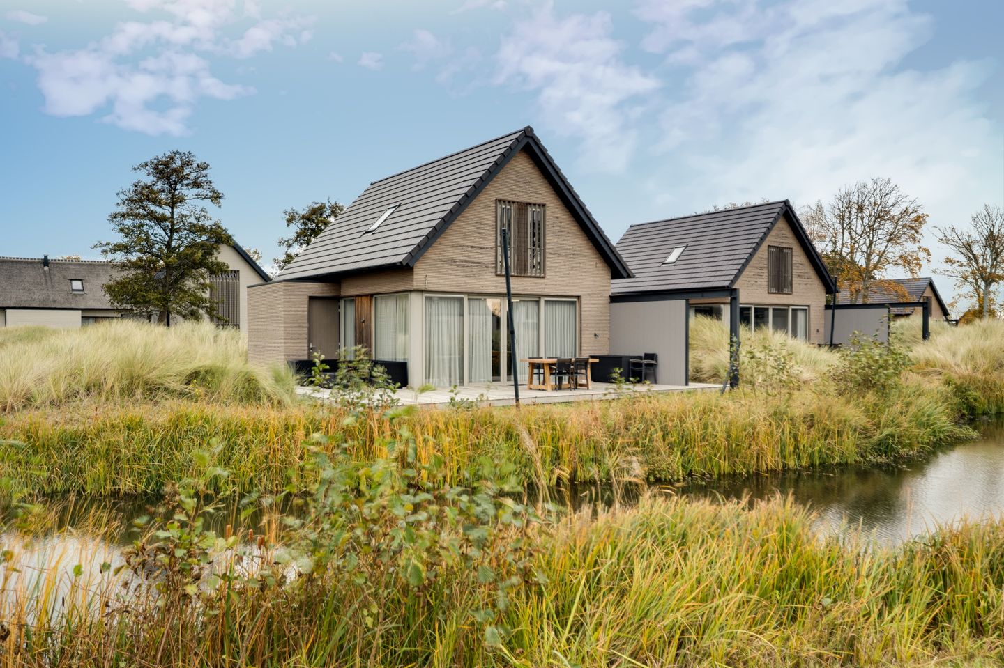 De woning is gebouwd in 2019 en is volledig ingericht voor comfortabel verblijf. Dankzij de grote raampartijen en de prettige indeling voelt de villa licht en ruim aan. De woonkamer vormt het hart van de woning en staat in directe verbinding met het terras en de tuin. Vanuit hier kijk je prachtig uit over de natuurlijke omgeving met groen en waterpartijen, wat zorgt voor veel privacy en rust.