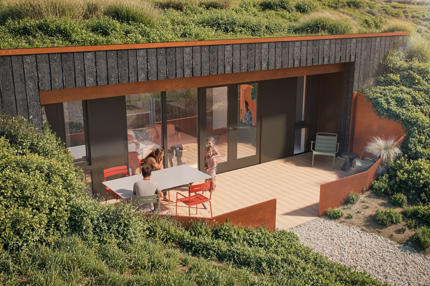Duyn Suite 6-person Comfort – perfect for a family of up to six who wish to enjoy the same luxury and atmosphere with extra space. This suite is situated slightly higher on the dune and only partially underground. The central living and dining area is adjacent to three double bedrooms, a bathroom, and a separate toilet. The sloping roof gives the suite a spacious and light-filled feeling. Large windows on both the east and west sides allow guests to enjoy both sunrise and sunset from inside. The stone exterior forms a strong frame around the entrance and partially covered tiled terrace. The roof is equipped with solar panels, contributing to the sustainable energy supply for the entire park.