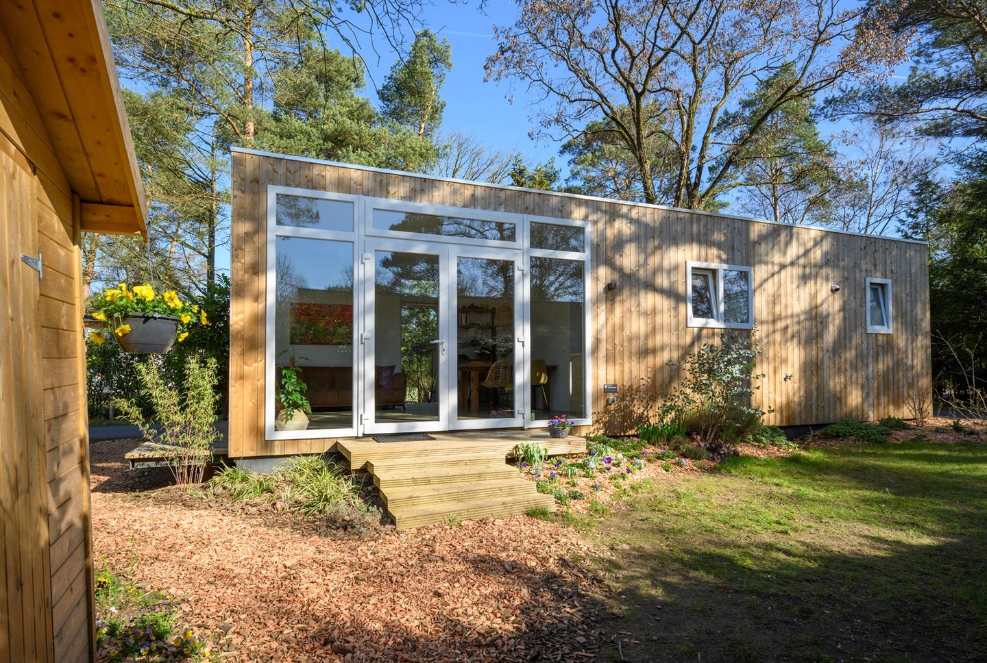De woning staat op een perceel van circa 300 m² en beschikt over een fijne houten vlonder waar je in alle rust kunt ontspannen. De natuurlijke omgeving met vogels en eekhoorns maakt deze plek extra bijzonder.