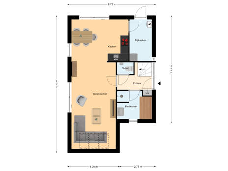 - Hoekkeuken met een koelkast met vriezer, 4-pits inductiekookplaat, vaatwasser en afzuigkap. Aan de eettafel kun je gezellig samen eten. Ook hier kun je middels de 2e schuifpui direct de tuin inlopen.