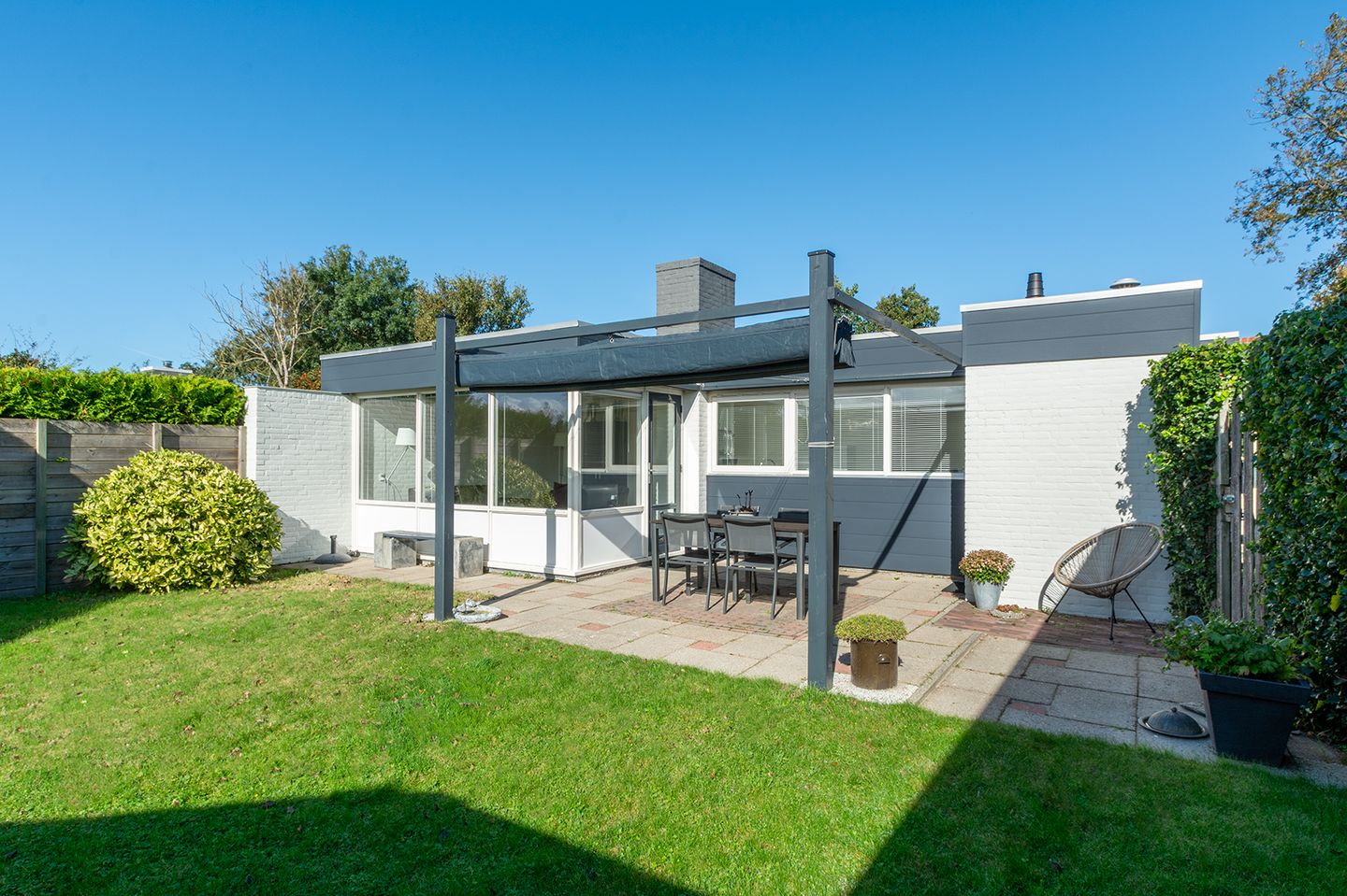 Vanuit de woonkamer loopt u direct de beschutte, zonnige tuin in. Hier vindt u een terras met pergola en zonwering.