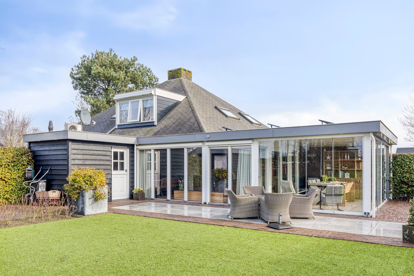 De woonkamer is licht en sfeervol dankzij de vele raampartijen, waarvan een deel is voorzien van screens. De vide geeft de ruimte een speels en ruimtelijk karakter. Via de schuifpui lopen we door naar de volgende eyecatcher van deze woning: de aangebouwde luxe tuinkamer. Deze schitterende ruimte vergroot de leefoppervlakte aanzienlijk en vormt een perfecte overgang tussen binnen en buiten. Dankzij de drie glazen schuifwanden kan de ruimte volledig worden geopend, waardoor tuin en woonkamer naadloos in elkaar overlopen. Hier geniet je in alle seizoenen van het buitenleven. Gezien de grootte (circa 19 m2) zou je hier met aanpassingen nog een extra slaapkamer kunnen realiseren.