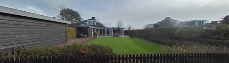 De tuin biedt vrij zicht op het speelveld van het park, wat een open en ruimtelijk gevoel geeft. Daarnaast is er een vrijstaande houten berging aanwezig, ideaal voor fietsen en tuingereedschap.