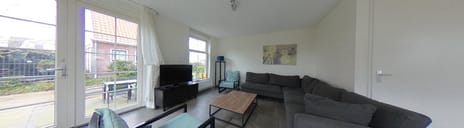 Dit ruime 5-kamerwoning is volledig uitgevoerd in neutrale grijs/wit tinten en wordt gemeubileerd verkocht. Op de gehele begane grond is de woning voorzien van een lichtgrijze plavuizenvloer. Na de entree, met meterkast, garderobekast, trapopgang en toiletruimte met zwevend toilet en fonteintje, stap je de woonkamer met open keuken in. De open L-vormige keuken is aan de voorzijde gelegen en beschikt over een stenen aanrechtblad met 5-pits fornuis en is voorzien van een vaatwasser.