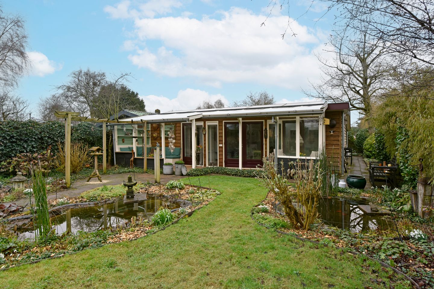 Vanuit de veranda, maar ook via het pad naast de woning, bereik je de achtertuin. De tuin is ca. 25 meter diep en 13 meter breed, zonnig gelegen op het zuiden, prachtig aangelegd met diverse zitjes, 2 vijvers en een houten berging met elektra. Aan de achterzijde grenst de tuin aan een sloot met een eigen steiger. Door de gevarieerde inrichting vind je altijd een plekje in de zon of schaduw.