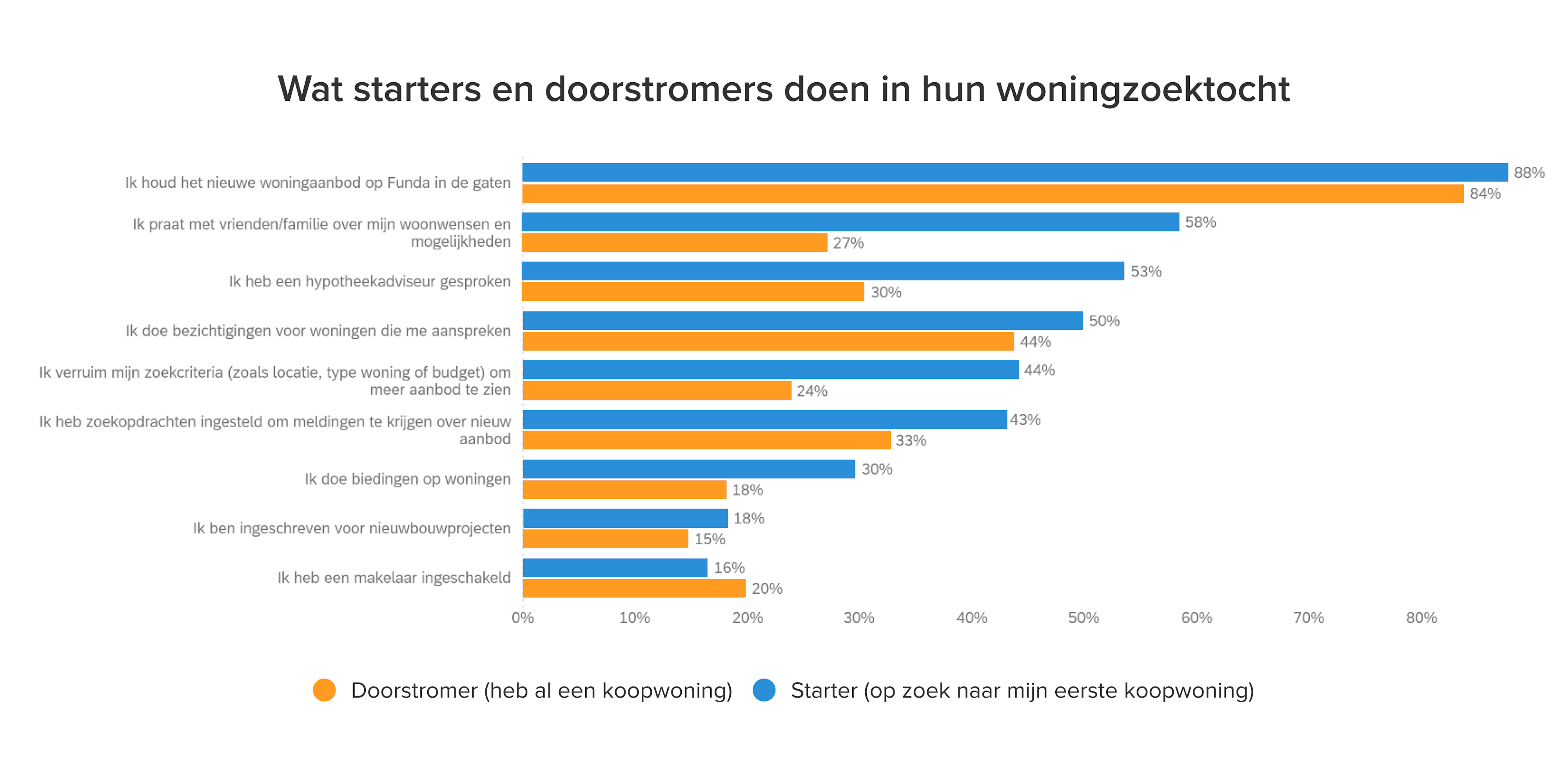 Starters zijn actiever in hun zoektocht naar een huis dan doorstromers. Ze voeren vaker gesprekken met een hypotheekadviseur en betrekken hun omgeving intensiever bij hun keuzes. Ook zoeken ze breder: ze stellen vaker alerts in en hanteren ruimere zoekcriteria. Dat wijst erop dat starters meer moeite moeten doen om een passend huis te vinden binnen het huidige aanbod.