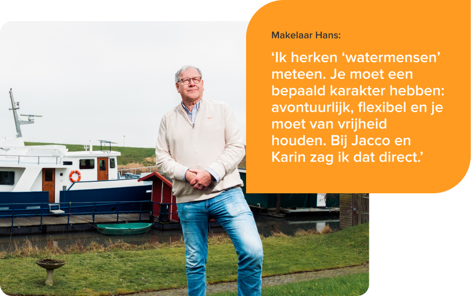 ‘Er komt veel op je af als je besluit op het water te wonen’, vertelt Hans. ‘Je wordt eigenaar van de boot, niet van de grond, en je pacht de ligplaats. Ik vind het prachtig dat mensen hiervoor kiezen. Daarna komt voor mij de belangrijkste stap: de juiste mensen samenbrengen en hen de juiste stappen laten zetten. Zo heb ik Jacco en Karin geholpen bij het vinden van een hypotheek voor een woonschip. In Nederland kan dat maar bij twee financiers. Daarnaast komt er flink wat papierwerk bij kijken, zoals water- en ligplaatsvergunningen.