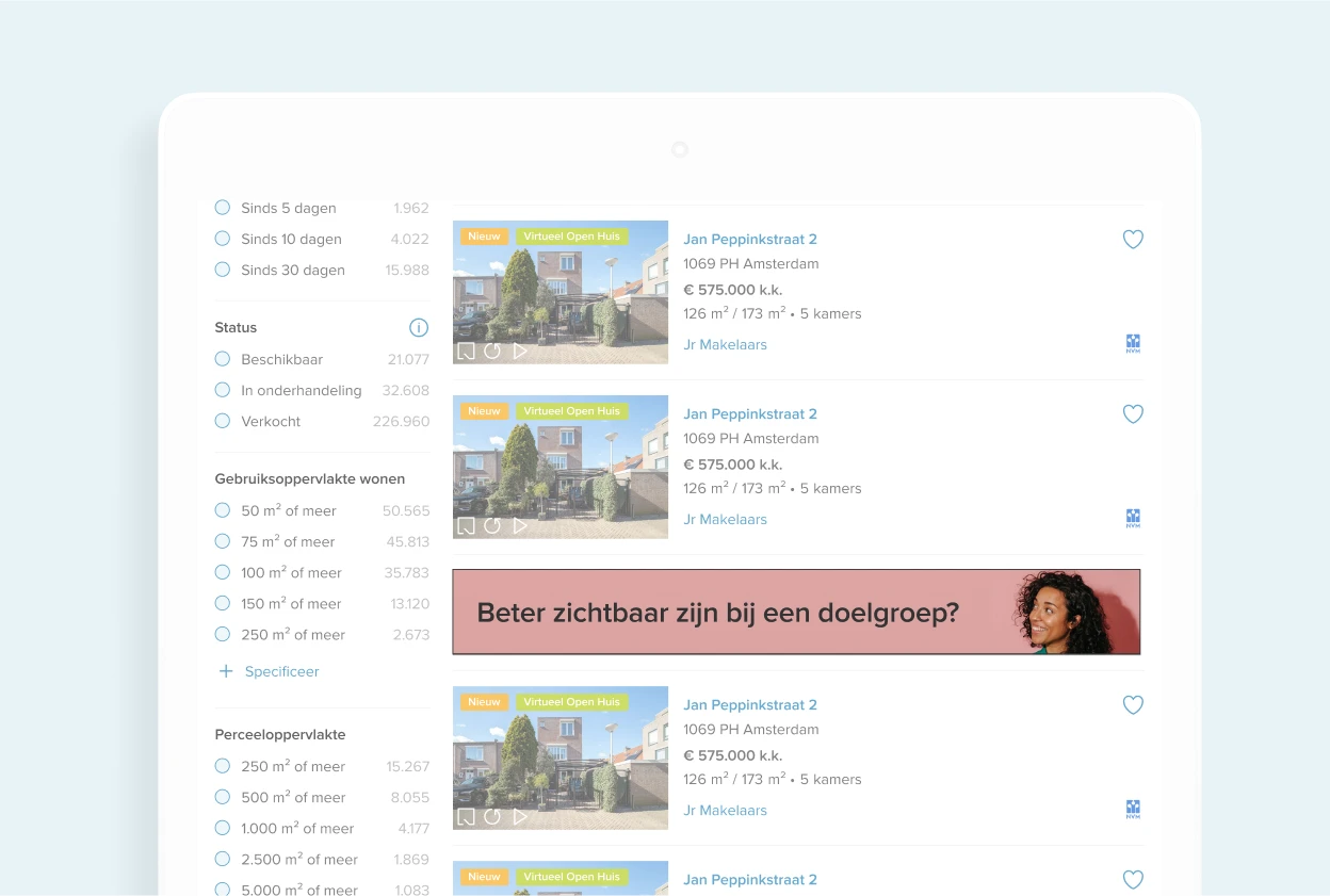 ‘Als jij de lokale specialist in Amsterdam-Zuid bent, dan is jouw advertentie niet relevant voor verkopers in Amsterdam-Noord,’ stelt accountmanager Sef van Vlijmen. In zo’n situatie is adverteren op maat een slimmere keuze. Je bereikt daarmee een relevante doelgroep én je hebt minder concurrentie van andere makelaars die hier adverteren. Zo komt jouw advertentie vaker in beeld, bij de doelgroep die in dit gebied op zoek is naar een expert.’