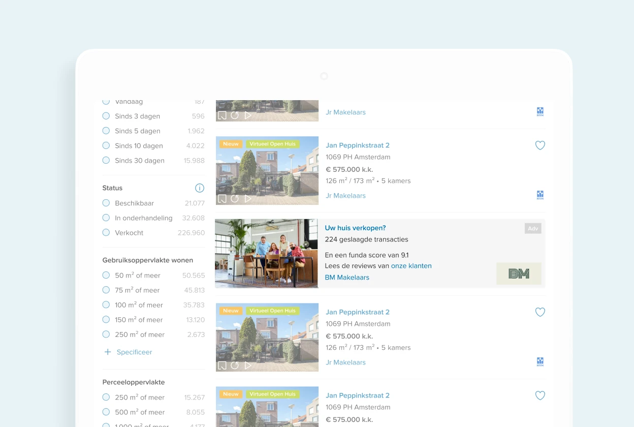 Na de lancering analyseert funda samen met jou de resultaten van de campagne. Sef: ‘Loopt de advertentie minder goed dan verwacht, dan helpen we om 'm beter te maken. We kunnen advertenties met verschillende foto’s of teksten tegelijkertijd testen, zodat we zien wat het best werkt.’