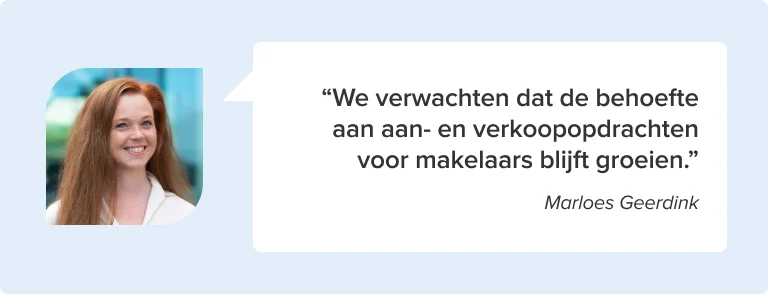 ‘Kostenefficiënt werken wordt voor makelaars dus nog belangrijker, maar ook de relatie met klanten: we zien dat het steeds belangrijker wordt om die sterker en persoonlijker te maken, zodat ze op een later moment weer terugkeren. Klanten verwachten steeds meer van hun makelaar, zoals advies over verduurzamen of renoveren, maar ook aanvullende diensten. We verwachten dat de rol van makelaars daardoor zal verbreden.’