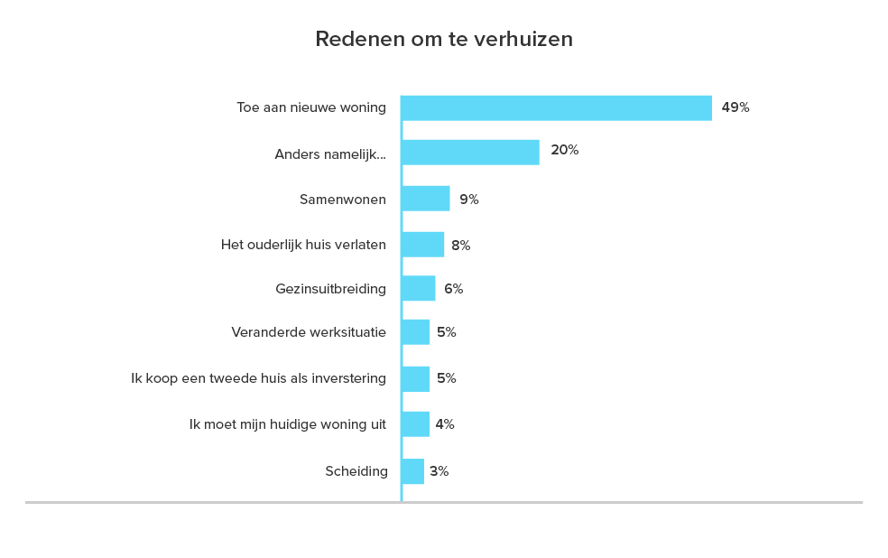 Ook dit kwartaal zijn er geen verschuivingen in de redenen om te verhuizen. Naast dat mensen toe zijn aan een nieuwe woning worden samenwonen, het verlaten van het ouderlijk huis en gezinsuitbreiding als belangrijkste life events genoemd als verhuisredenen.