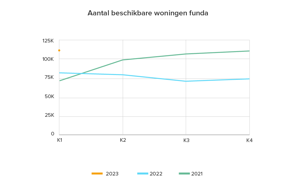 Het aantal contactaanvragen via funda met de makelaar door consumenten ligt het eerste kwartaal 7,8 procentpunt hoger dan vorig kwartaal en 22,4 procentpunt lager ten opzichte van het eerste kwartaal van 2022. Het aantal beschikbare woning op funda is nagenoeg gelijk in het eerste kwartaal van dit jaar t.o.v. laatste kwartaal vorig jaar. Dit betekent ook dat de concurrentie onder kopers per beschikbare woning licht is gestegen.