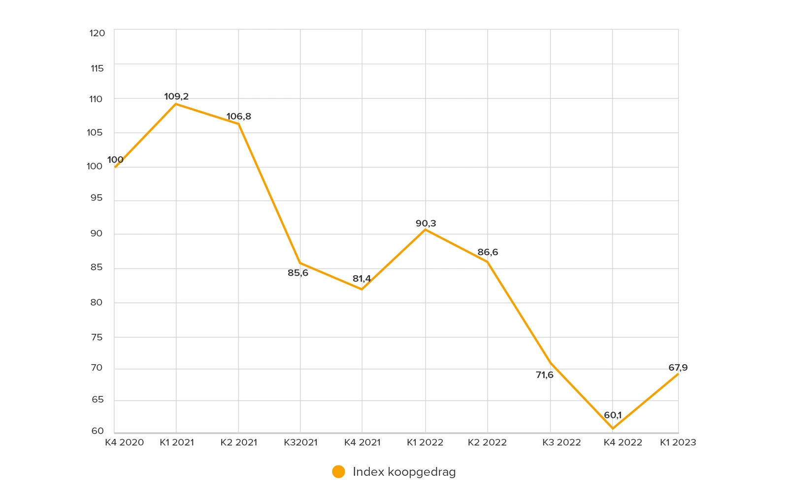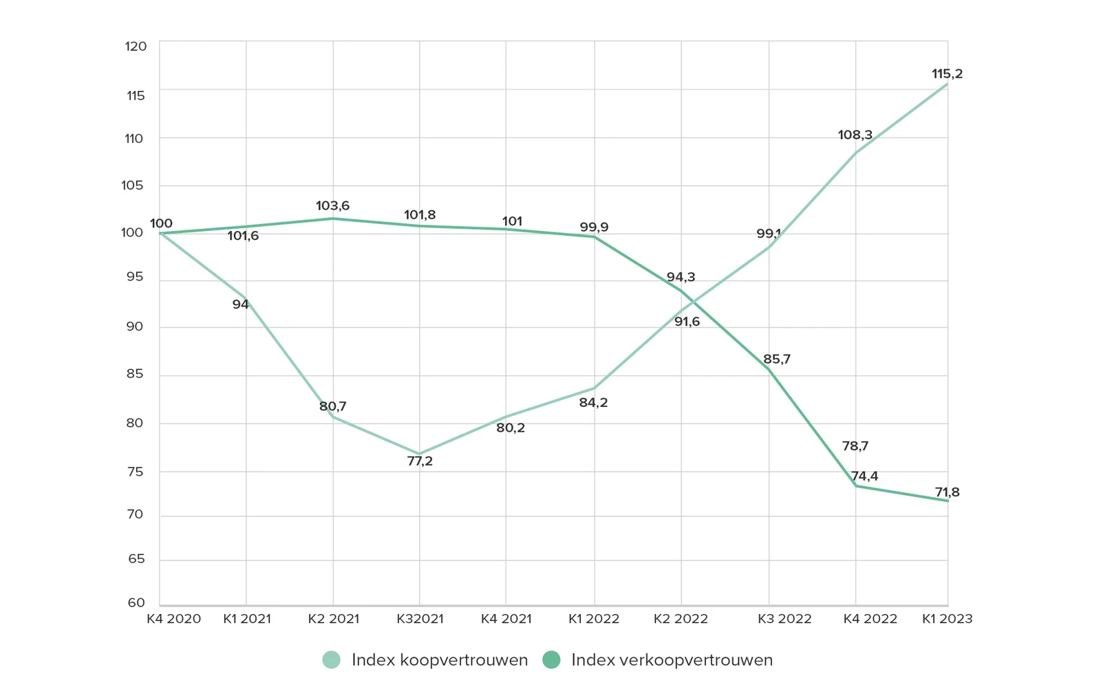 Het koopvertrouwen daalt in het vierde kwartaal verder door met 4,6 procentpunt naar 108,6. Dit kwartaal vindt 17% van de consumenten de markt gunstig voor koop. Het verkoopvertrouwen neemt toe met 3,1 procentpunt. Dit kwartaal vindt 63% van de consumenten dat de huidige markt een goed moment is om te verkopen. Dit ligt ook boven hetzelfde kwartaal in 2022, toen vond 44% van de consumenten het een goed moment om te verkopen.