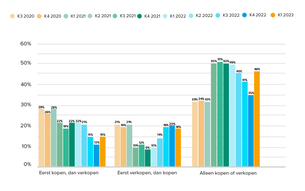 In het eerste kwartaal van 2023 zien we dat de groep die eerst wil kopen en dan wil verkopen weer iets toeneemt naar 15%. Terwijl de groep die eerst wil verkopen afneemt naar 18%. Opvallend is dat de groep die alleen koopt of verkoopt sterkt toeneemt. Uit nadere analyse blijkt dat dit met name om starters gaat. Hieruit blijkt dat deze groep weer actiever wordt op de woningmarkt.