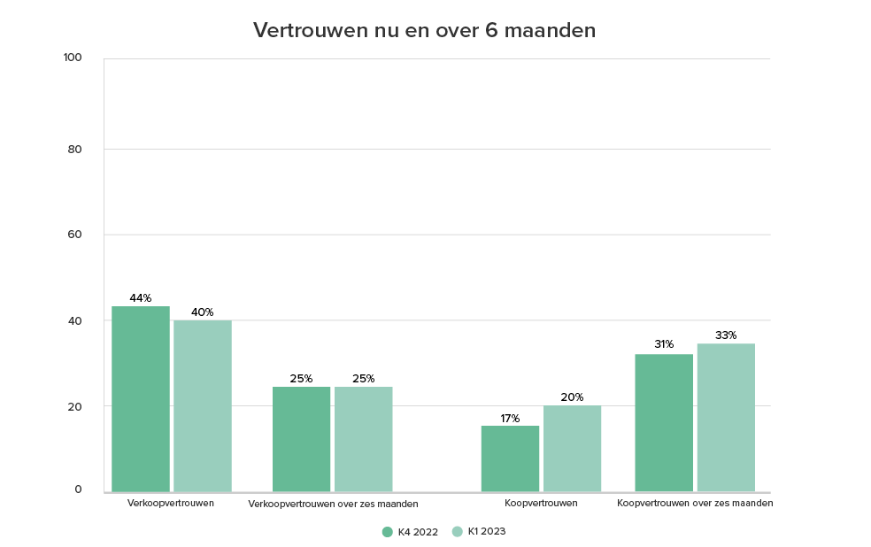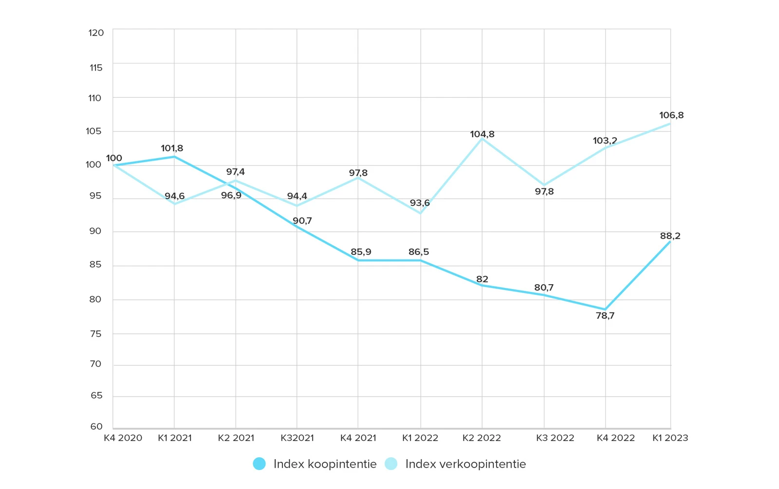De stijging in koopvertrouwen wordt nu ook bevestigd door een stijging in koopintentie. De intentie om binnen nu en drie maanden een huis te kopen ligt 9,5 procentpunt hoger dan vorig kwartaal en 1,7 procentpunt hoger dan het eerste kwartaal vorig jaar. De intentie om binnen nu en drie maanden een huis te verkopen neemt met 3,6 procentpunt toe ten opzichte van vorig kwartaal, en ligt 13,2 procentpunt hoger dan in het eerste kwartaal van 2022.