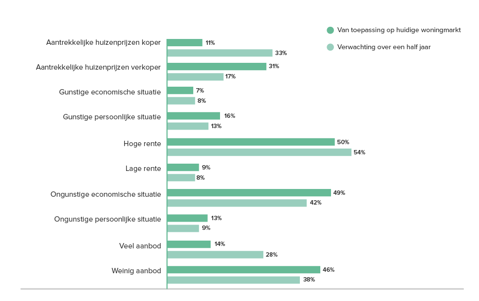 De huidige woningmarkt wordt volgens consumenten beïnvloed door hoge rente (50%), een ongunstige economische situatie (49%) en weinig aanbod van woningen (46%). Een jaar geleden werd het sentiment op de woningmarkt met name gedomineerd door het geringe aanbod en de lage rente. Vooruitkijkend verwacht men dat de ongunstige economie en hoge rente een belangrijke rol blijven spelen (respectievelijk 42% en 54$), maar dat er meer aanbod komt van woningen (28%) en de prijzen aantrekkelijker worden voor de koper (33%).