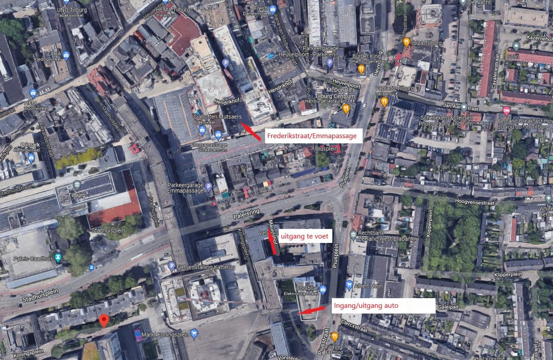 De parkeergarage is te voet te bereiken middels de achteringang aan het Mauritshof. Dat is gelegen aan de Paleisring schuin tegenover de ingang van de Emmapassage/Frederikstraat. Hier loopt u dus zo het centrum van Tilburg in.