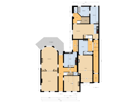 Via de mooie entree kom je in de royale hal/gang en garderobe met marmeren vloer. Aan de centrale gang liggen de grote kamer-en-suite (65 m2), met originele schuifdeuren en open haard, kantoor of ‘stijlkamer’, ruime, dichte keuken met luxe opstelling, toilet en achterentree. Tevens zijn een provisiekelder, wijnkelder en stookkelder aanwezig. Achter het huis aan de tuinzijde bevindt zich een fijne veranda.