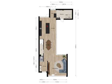 Via de verzorgde entree betreed je de woning. In de hal vind je de garderobe en een moderne toiletruimte met hangend toilet en fontein. Vanuit hier loop je door naar de ruime en lichte woonkamer. Aan de voorzijde bevindt zich het comfortabele zitgedeelte, waar de sfeervolle gashaard direct een warme, prettige ambiance creëert. In het midden van de ruimte is het eetgedeelte gesitueerd, perfect als centraal punt voor lange diners met familie en vrienden. De ruimte loopt vloeiend over in de luxe open keuken met kookeiland. De keuken is van alle gemakken voorzien en beschikt over hoogwaardige inbouwapparatuur, waaronder een koelkast, vaatwasser, Bora inductiekookplaat met geïntegreerde afzuiging, Gaggenau oven en een Quooker. Daarnaast biedt de keuken volop opbergruimte in de kasten en lades. De praktische trapkast zorgt voor extra bergruimte. De gehele begane grond is voorzien van vloerverwarming en afgewerkt met een stijlvolle betonlook gietvloer, wat zorgt voor een strak, modern en comfortabel woonklimaat. Dankzij de open indeling en de vele raampartijen heb je vanuit vrijwel elk gedeelte van de woonkamer en keuken prachtig zicht op de tuin, wat zorgt voor een fijne lichtinval en een ruimtelijk gevoel. Vanuit de keuken is er directe toegang tot de bijkeuken, waar een sfeervolle barista-hoek is ingericht. Aansluitend bevindt zich een portaal met toegang tot de tuin en de bijkeuken, ideaal voor opslag of hobbyruimte.