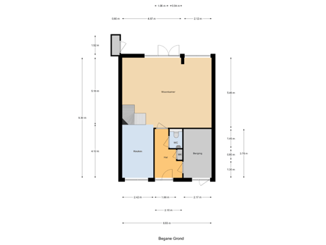 Via de entree komt u in de ruime hal met meterkast (met krachtstroom/3 fase), toiletruimte en toegang tot de inpandige bergruimte. Deze berging is tevens vanaf de buitenzijde van de woning te bereiken.