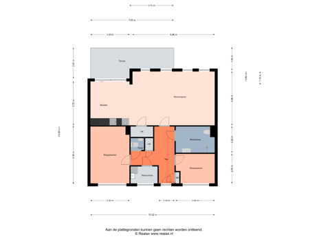 De T-vormige hal biedt toegang tot alle vertrekken. Hier bevinden zich twee ruime slaapkamers van respectievelijk 16 m² en 8 m², een praktische wasruimte/inpandige berging, een modern hangend toilet met fonteintje. De royale badkamer is voorzien van een doucheruimte, wastafel, tweede toilet. Tevens is vanuit de hal een kast voor extra bergruimte.