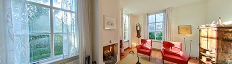 Een intieme living met open haard vormt een rustige plek voor ontvangst en ontspanning. Twee werkkamers waarvan één met schouw houtkachel bieden ruimte voor thuiswerken of ateliergebruik.