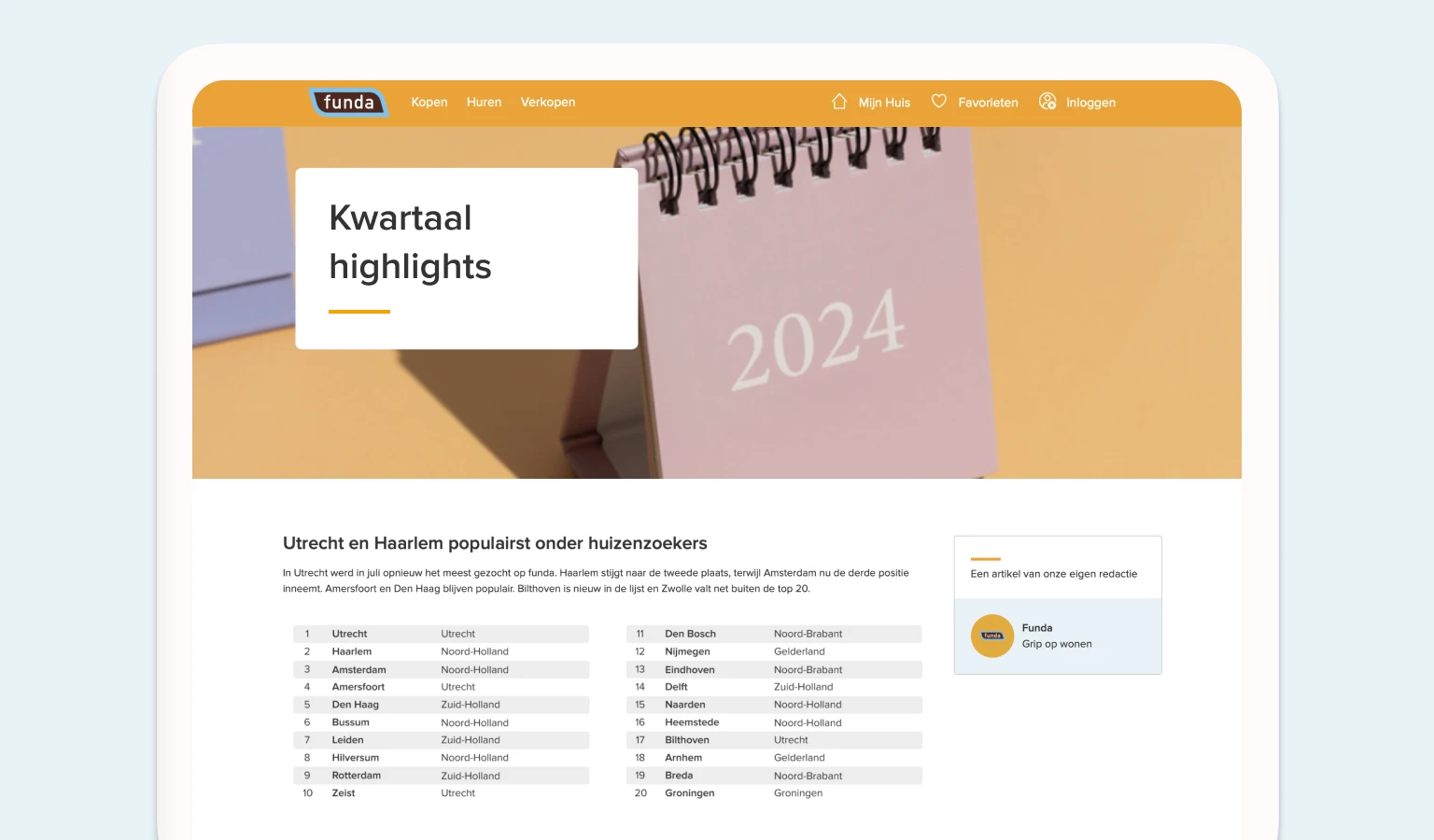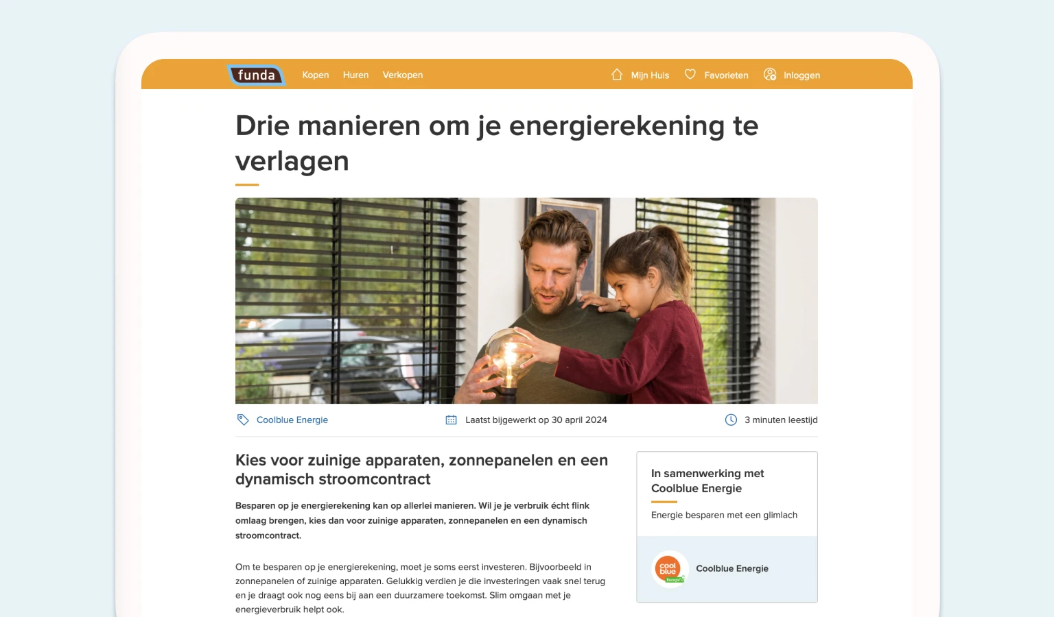 Op funda’s contentplaform funda.nl/meer-weten vinden funda-bezoekers informatie en inspiratie over wonen, kopen en verkopen. Van praktische tips voor verbouwingen tot de laatste woontrends en inzichten over de woningmarkt. Dit sluit perfect aan op hun informatiebehoefte, wat blijkt uit de positieve feedback die 85% van onze content krijgt. Ook jij kunt deze doelgroep verder helpen met jouw expertise. We hebben de mogelijkheden voor branded content namelijk flink uitgebreid.