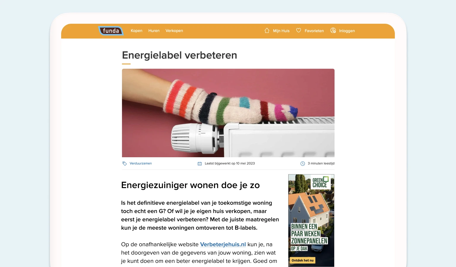 Op funda’s contentplaform funda.nl/meer-weten vinden funda-bezoekers informatie en inspiratie over wonen, kopen en verkopen. Van praktische tips voor verbouwingen tot de laatste woontrends en inzichten over de woningmarkt. Dit sluit perfect aan op hun informatiebehoefte, wat blijkt uit de positieve feedback die 85% van onze content krijgt. Ook jij kunt deze doelgroep verder helpen met jouw expertise. We hebben de mogelijkheden voor branded content namelijk flink uitgebreid.