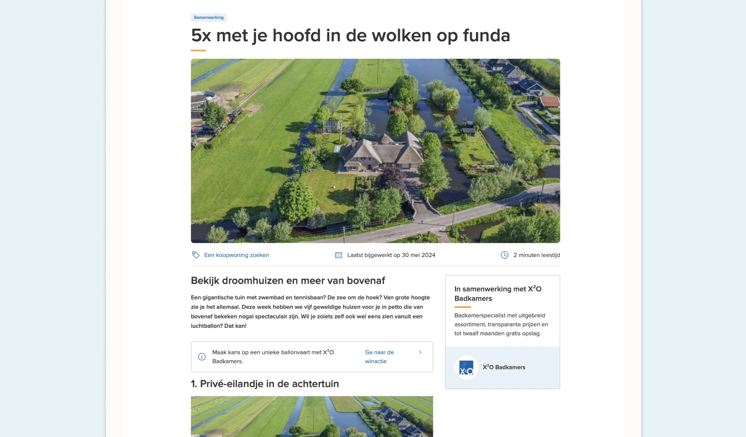 De meest voorkomende inzet is een contentsamenwerking, waarbij je als kennispartner met de redactie van funda samenwerkt aan een artikel of artikelserie. De samenwerking wordt expliciet vermeld bij het artikel en je hebt de mogelijkheid om in de tekst een aantal links toe te voegen naar je eigen website. Ga je voor een langdurige samenwerking met meerdere artikelen, dan worden al deze artikelen gebundeld op een partnerpagina, zoals deze voor X2 O Badkamers.