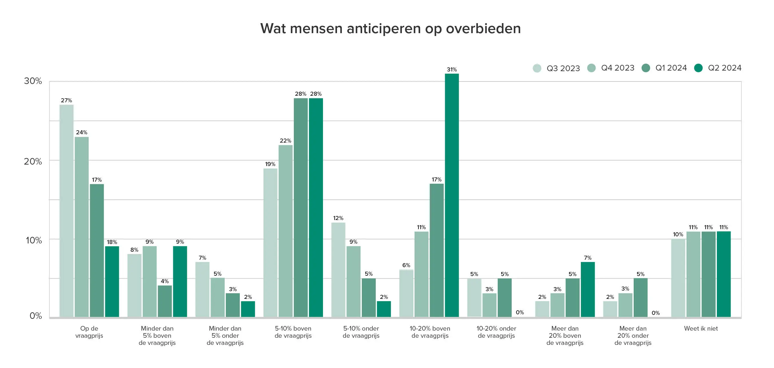Wederom denken meer consumenten dat flink overbieden de norm gaat zijn. Vorig kwartaal dacht 17% van de respondenten dat er gemiddeld tussen de 10 en 20% overboden zou worden. Dit tweede kwartaal steeg dit met 14 procentpunten tot maar liefst 31%. Bijna een derde verwacht dus dat overbieden tussen de 10 en 20% normaal is. Tegelijkertijd verwachten steeds mínder mensen een bod onder of gelijk aan de vraagprijs.